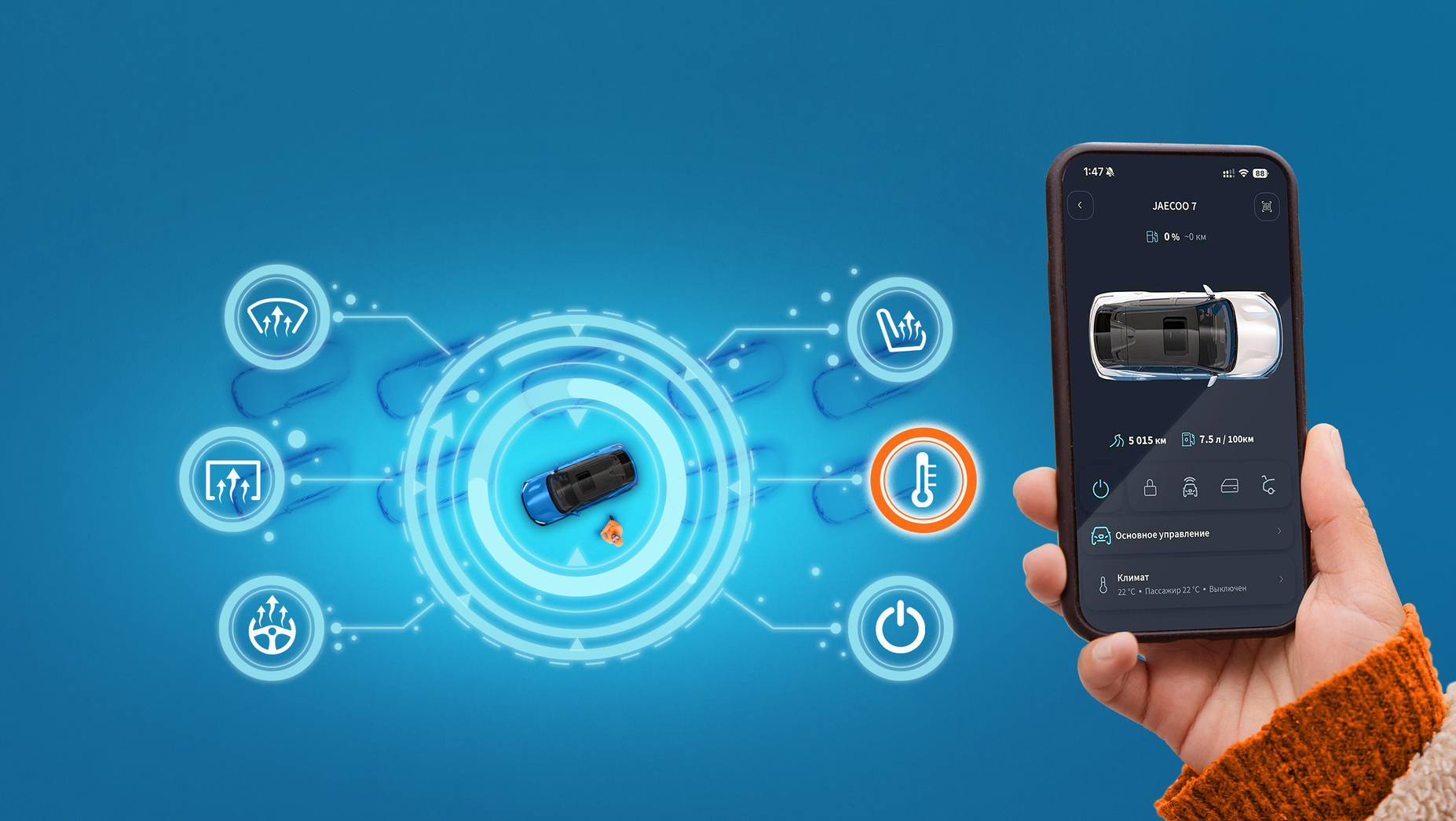 Это умная система, для взаимодействия с вашим JAECOO через мобильное приложение. С помощью мобильного устройства вы можете управлять автомобилем: климат контроль и подогревы, запуск двигателя, подача светового сигнала фарами, получать информацию о состоянии автомобиля и многое другое.